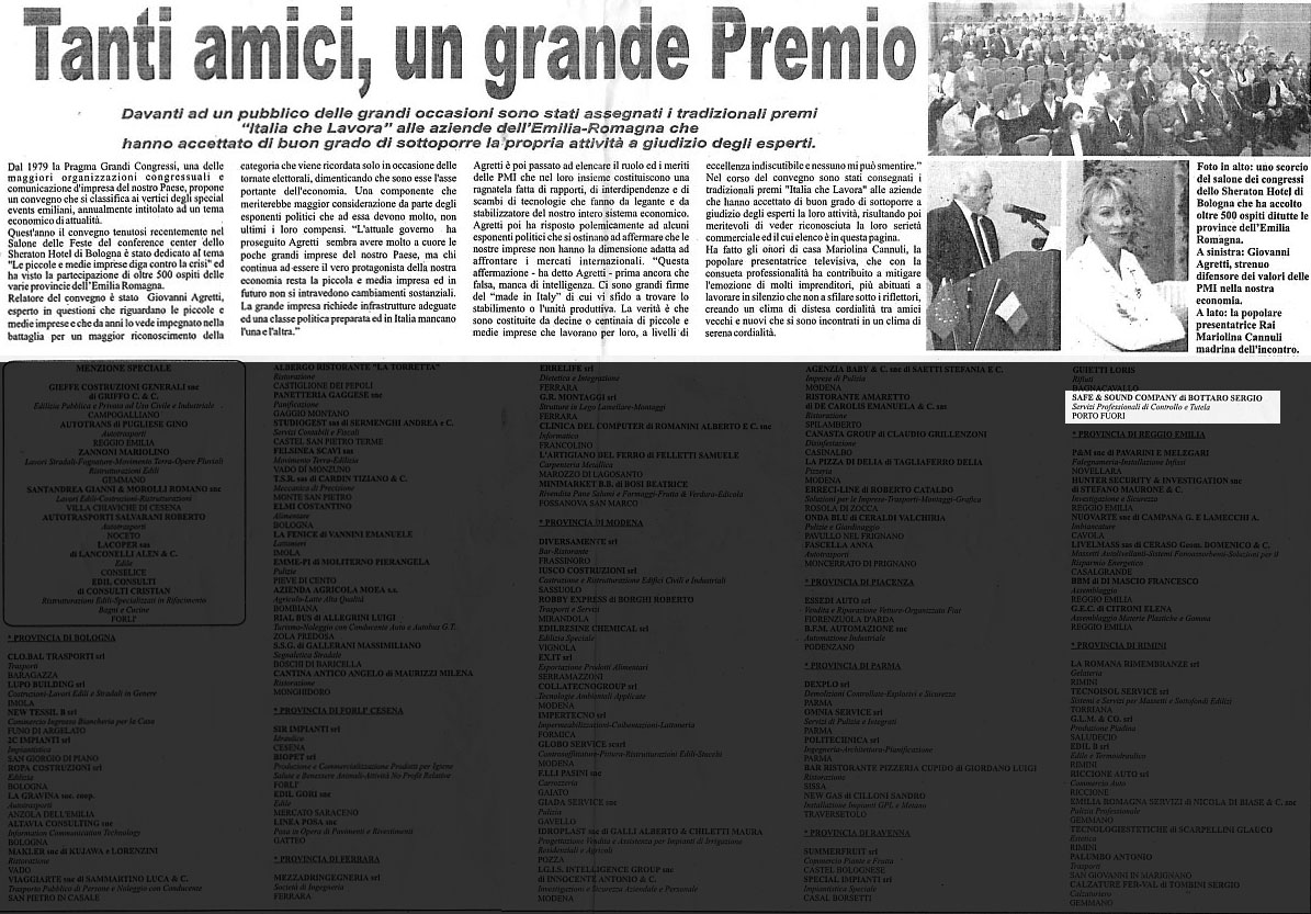 Alla cerimonia, svoltasi all’hotel Sheraton di Bologna, ha preso parte un centinaio di aziende emiliano-romagnole. Di queste, l’unica premiata nella categoria “controllo e tutela” è stata appunto la Safe & Sound, nella persona del titolare Sergio Bottaro.